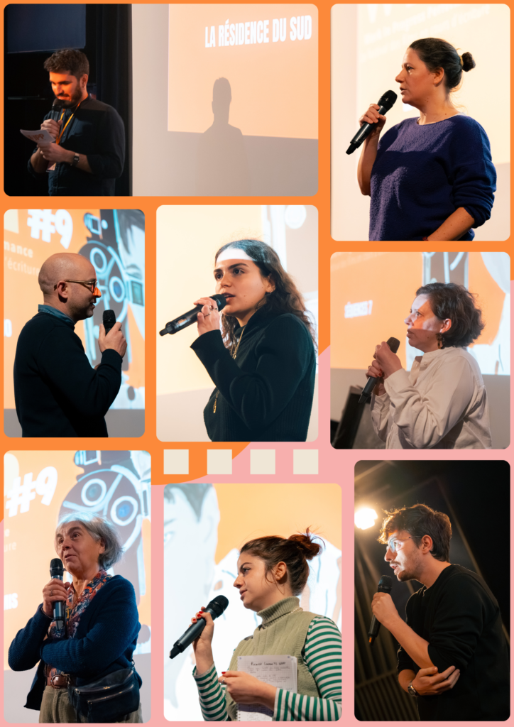 Les partenaires présents lors de l’édition #9 : Marie-Anne Campos (le G.R.E.C.), Olivier Rignault (Valence Scénario), Marianne Feingold (Aide à l’écriture de la Région Ile-de-France), Chloé Ponce-Voiron (Séquences 7), Carine Burstein (Atelier Scénario de la Fémis), Emma de Grieve (Cinémas 93), Tommy Baron (La Ruche-Gindou Cinéma)